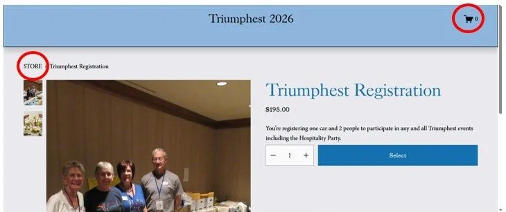 CLICK ON TRIUMPHEST REGISTRATION BELOW THIS CAUTION BOX TO ADD YOUR REGISTRATION FEE TO THE SHOPPING CART. CLICK ON THE “STORE” LINK AT THE TOP LEFT OF THE SCREEN TO RETURN TO THIS PAGE TO CONTINUE ADDING ITEMS. AFTER EACH ADDITION CLICK ON THE “STORE” LINK.